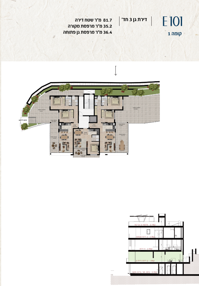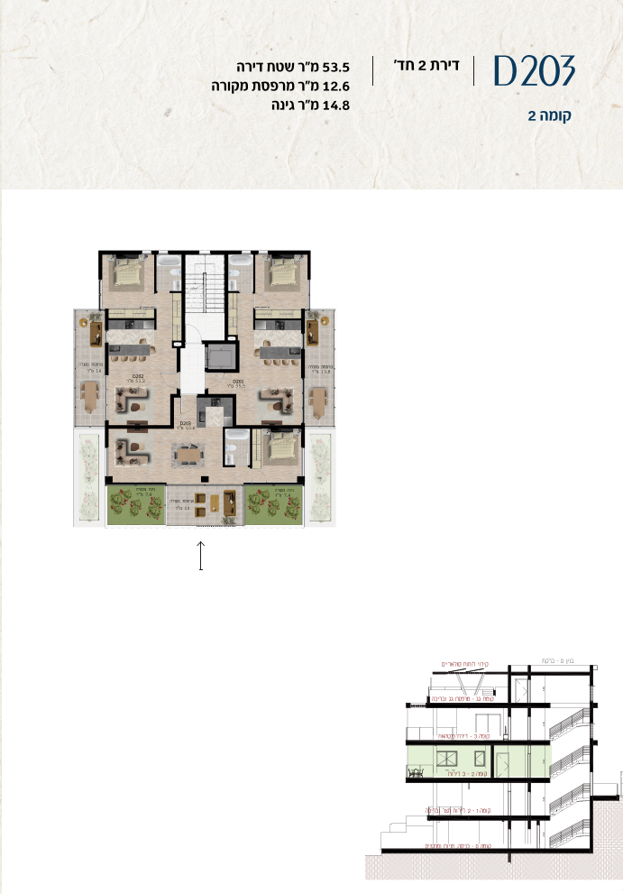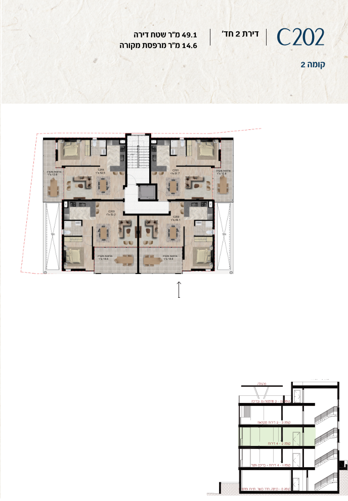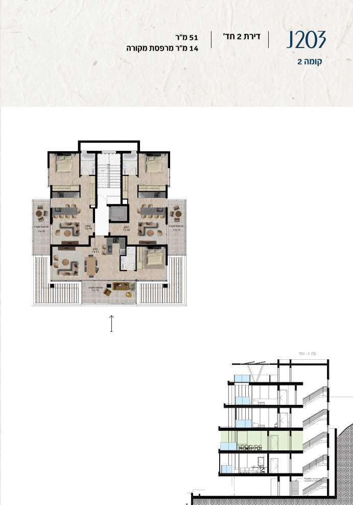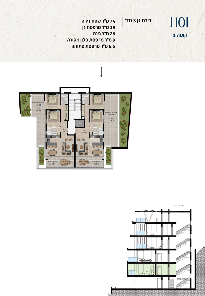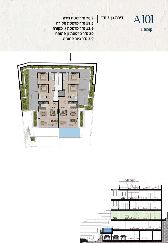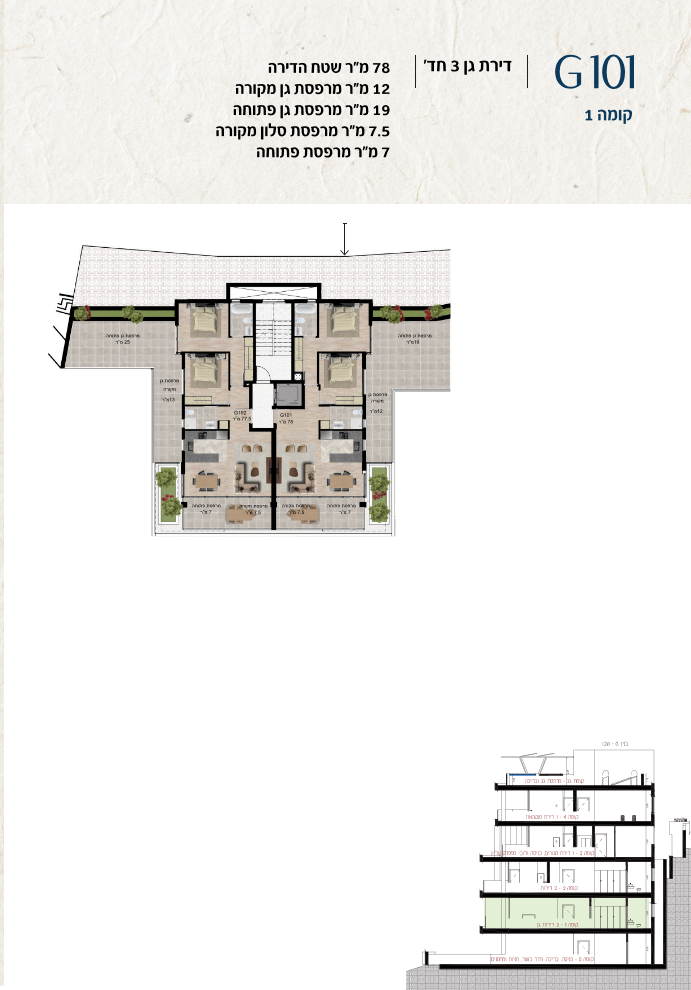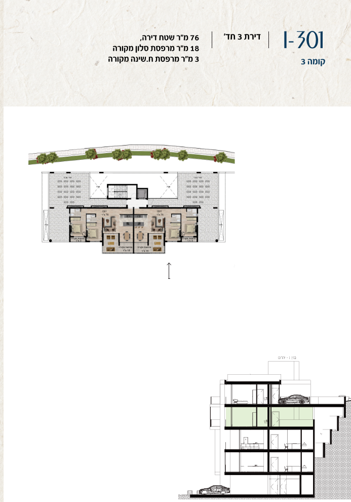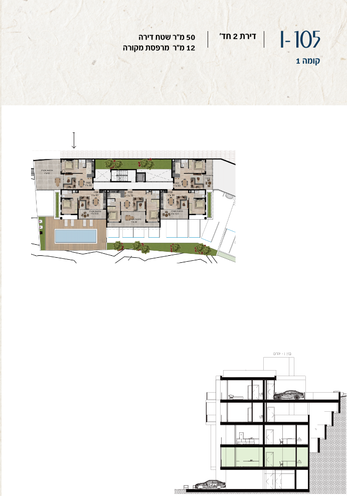 * כל המוצג בחוברת זו לרבות הדמיות, ריהוט ומיקומו, עיצוב (פנים וחוץ), ריצוף וחיפוי, אביזרים, פתחים, מידות (לרבות גודל ומיקום), פיתוח סביבתי, יעודי מקרקעין, מפרטים ומפרטים טכניים. אפשרויות השימוש ו/או הפעילות במתחם הפרויקט וכל חלקי המבנים ו/או במקרקעין והתיאור המוצג ביחס אליהם וכיוני – מופיעים לצורך המחשה בלבד ואין בהם כדי להוות מצג ו/או כדי לחייב, לרבות באשר למיקומם ו/או לאופן בנתיים ו/או לתכנונם ו/או לאישורם ו/או לאפשרות להשתמש בהם. יובהר כי התוכניות עשויות להשתנות בהתאם לדרישת הרשויות השונות עד לקבלת היתר בניה סופי
