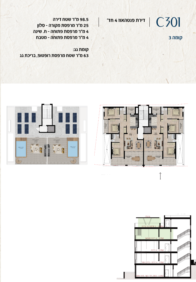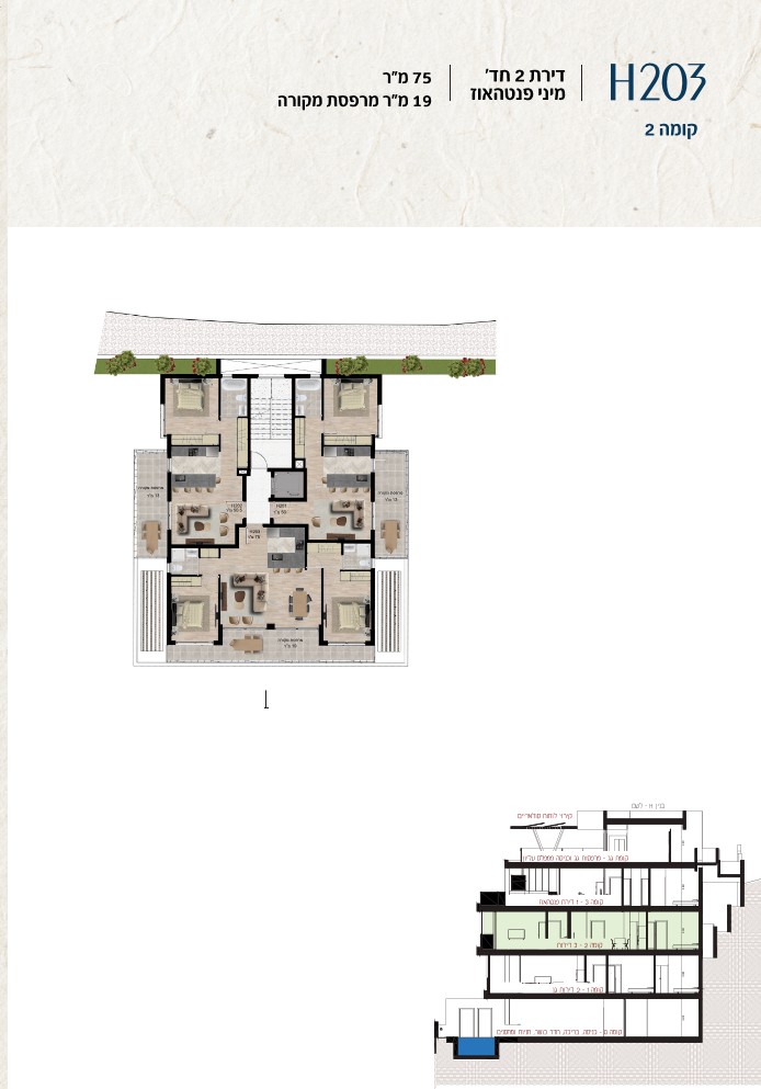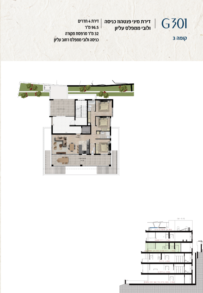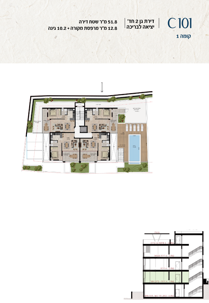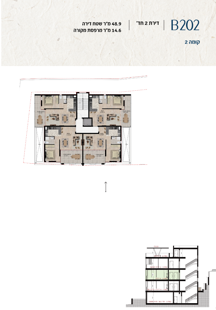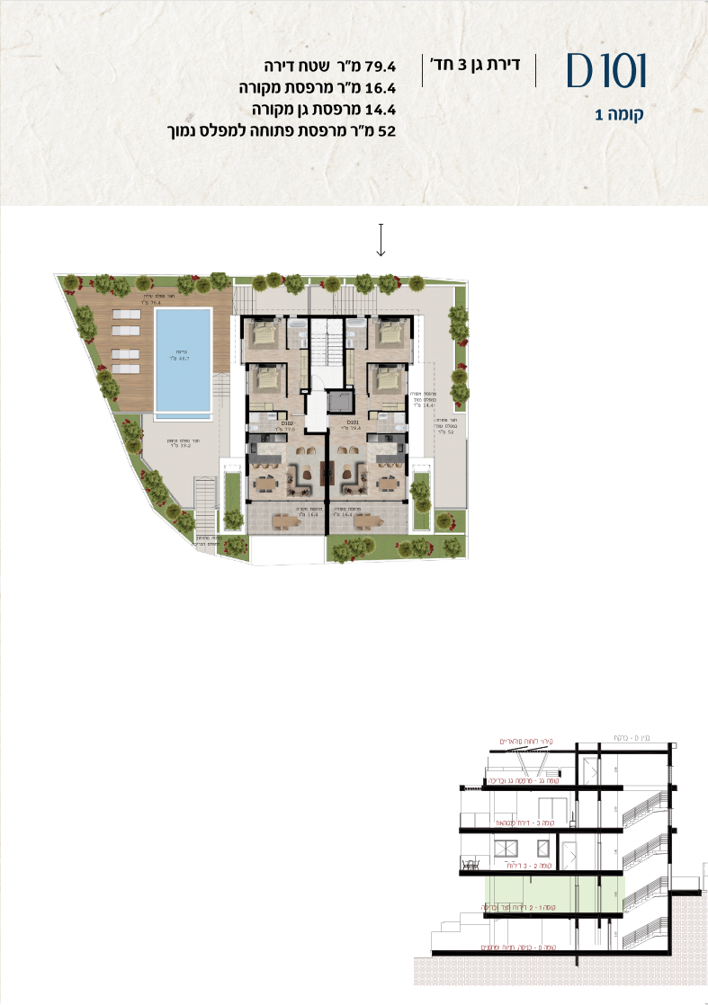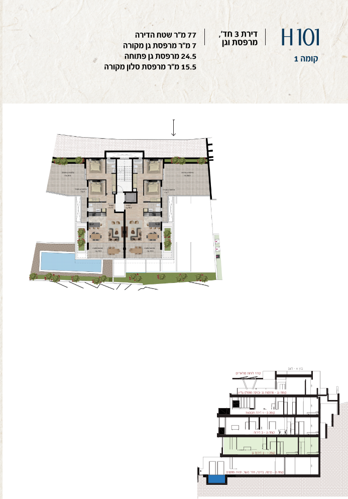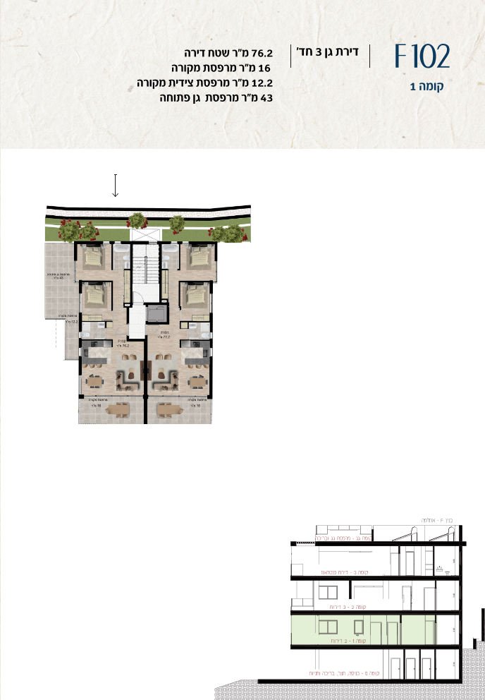 * כל המוצג בחוברת זו לרבות הדמיות, ריהוט ומיקומו, עיצוב (פנים וחוץ), ריצוף וחיפוי, אביזרים, פתחים, מידות (לרבות גודל ומיקום), פיתוח סביבתי, יעודי מקרקעין, מפרטים ומפרטים טכניים. אפשרויות השימוש ו/או הפעילות במתחם הפרויקט וכל חלקי המבנים ו/או במקרקעין והתיאור המוצג ביחס אליהם וכיוני – מופיעים לצורך המחשה בלבד ואין בהם כדי להוות מצג ו/או כדי לחייב, לרבות באשר למיקומם ו/או לאופן בנתיים ו/או לתכנונם ו/או לאישורם ו/או לאפשרות להשתמש בהם. יובהר כי התוכניות עשויות להשתנות בהתאם לדרישת הרשויות השונות עד לקבלת היתר בניה סופי