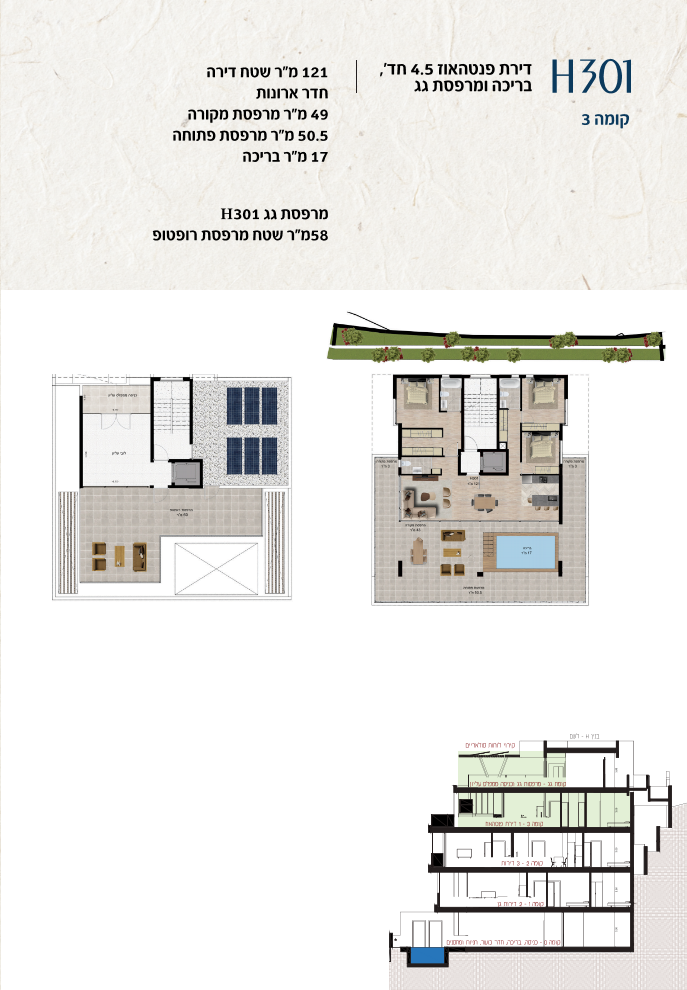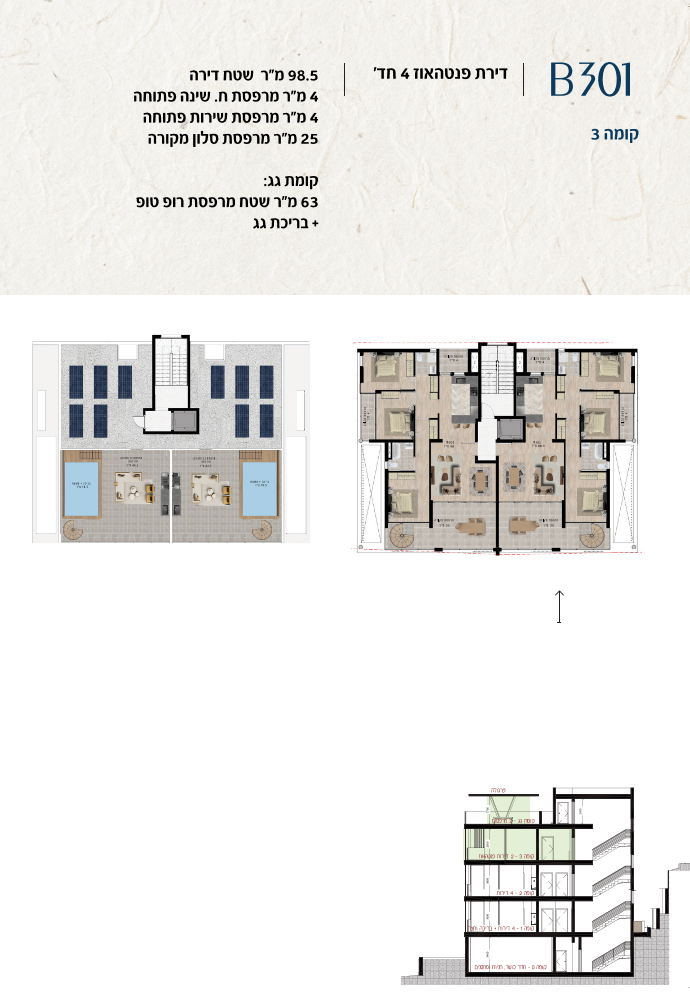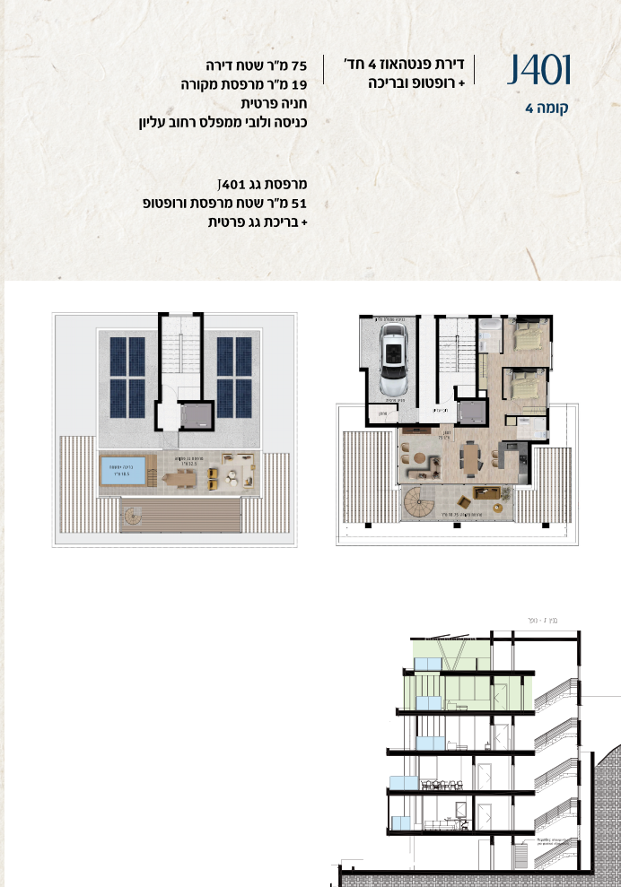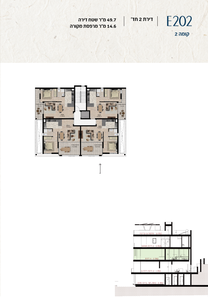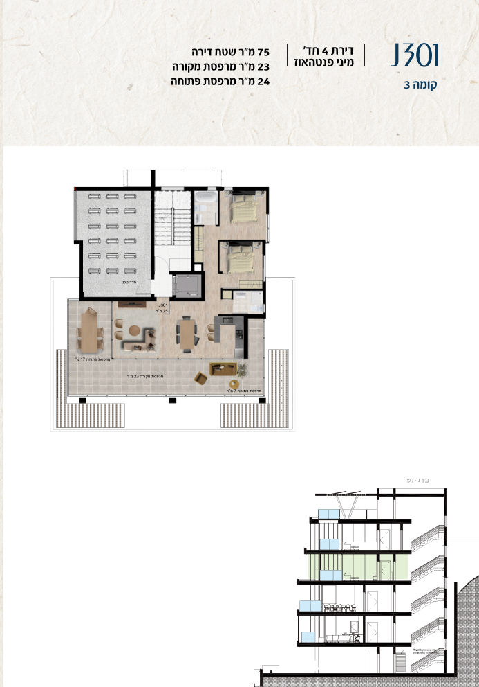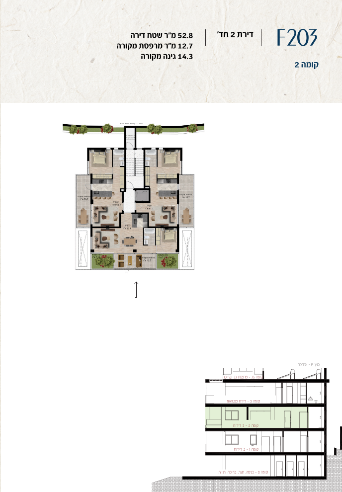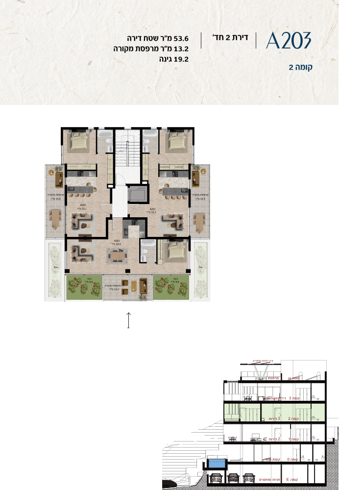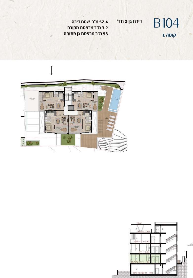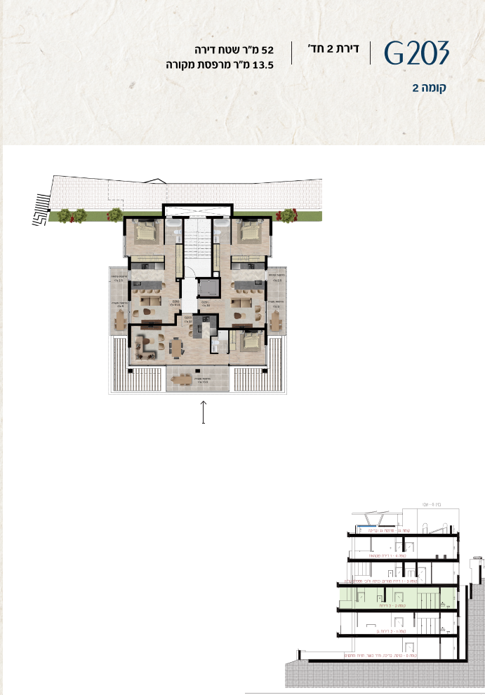 * כל המוצג בחוברת זו לרבות הדמיות, ריהוט ומיקומו, עיצוב (פנים וחוץ), ריצוף וחיפוי, אביזרים, פתחים, מידות (לרבות גודל ומיקום), פיתוח סביבתי, יעודי מקרקעין, מפרטים ומפרטים טכניים. אפשרויות השימוש ו/או הפעילות במתחם הפרויקט וכל חלקי המבנים ו/או במקרקעין והתיאור המוצג ביחס אליהם וכיוני – מופיעים לצורך המחשה בלבד ואין בהם כדי להוות מצג ו/או כדי לחייב, לרבות באשר למיקומם ו/או לאופן בנתיים ו/או לתכנונם ו/או לאישורם ו/או לאפשרות להשתמש בהם. יובהר כי התוכניות עשויות להשתנות בהתאם לדרישת הרשויות השונות עד לקבלת היתר בניה סופי